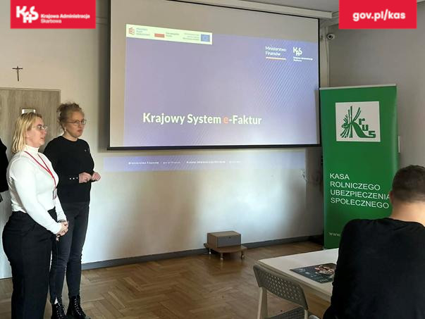 sala, na środku wyświetlona prezentacja KSeF, obok niej stoją dwie pracownice urzędu skarbowego, na krześle siedzi mężczyzna