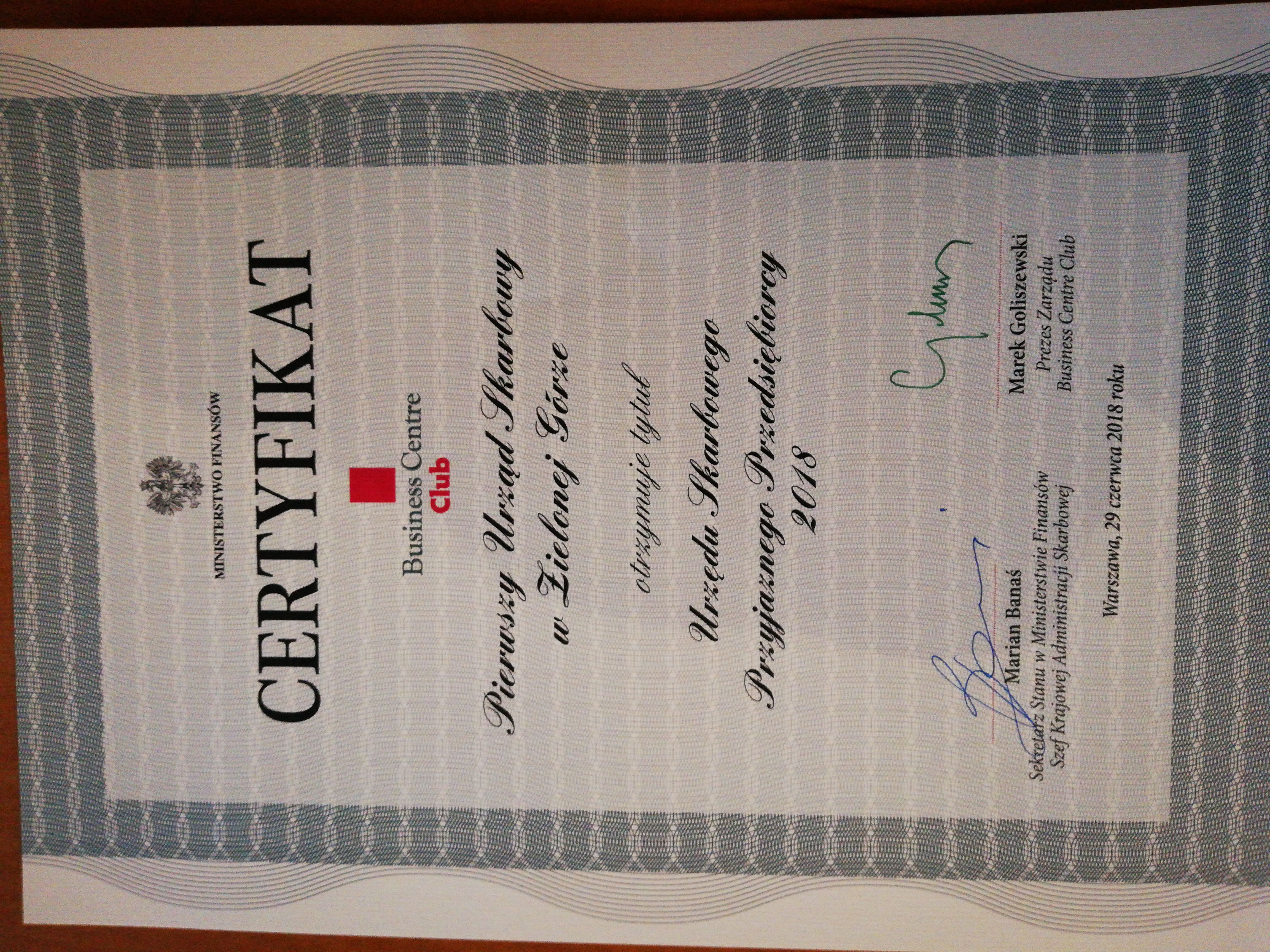 Certyfikat BCC dla Pierwszego Urzędu Skarbowego w Zielonej Górze