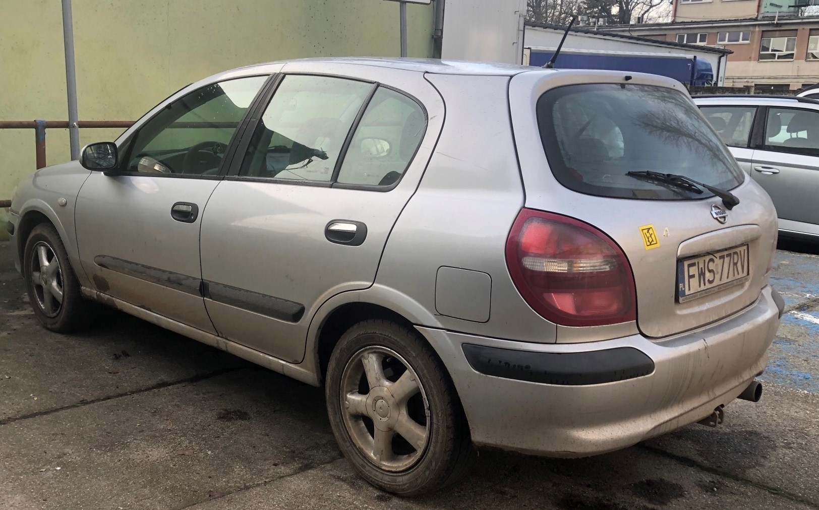 Tył i prawy bok srebrnego Nissana Almera hatchback z aluminiowymi felgami oraz czarnym odbojnikiem na przednich i tylnych drzwiach oraz zderzaku, widoczne drobne uszkodzenia lakiernicze i blacharskie, ślady  brudu po błocie