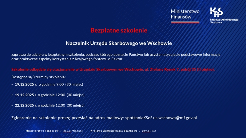 Ze względów organizacyjnych prosimy o przesłanie zgłoszenia na szkolenie na adres mailowy spotkaniaKSeF.us.wschowa@mf.gov.pl