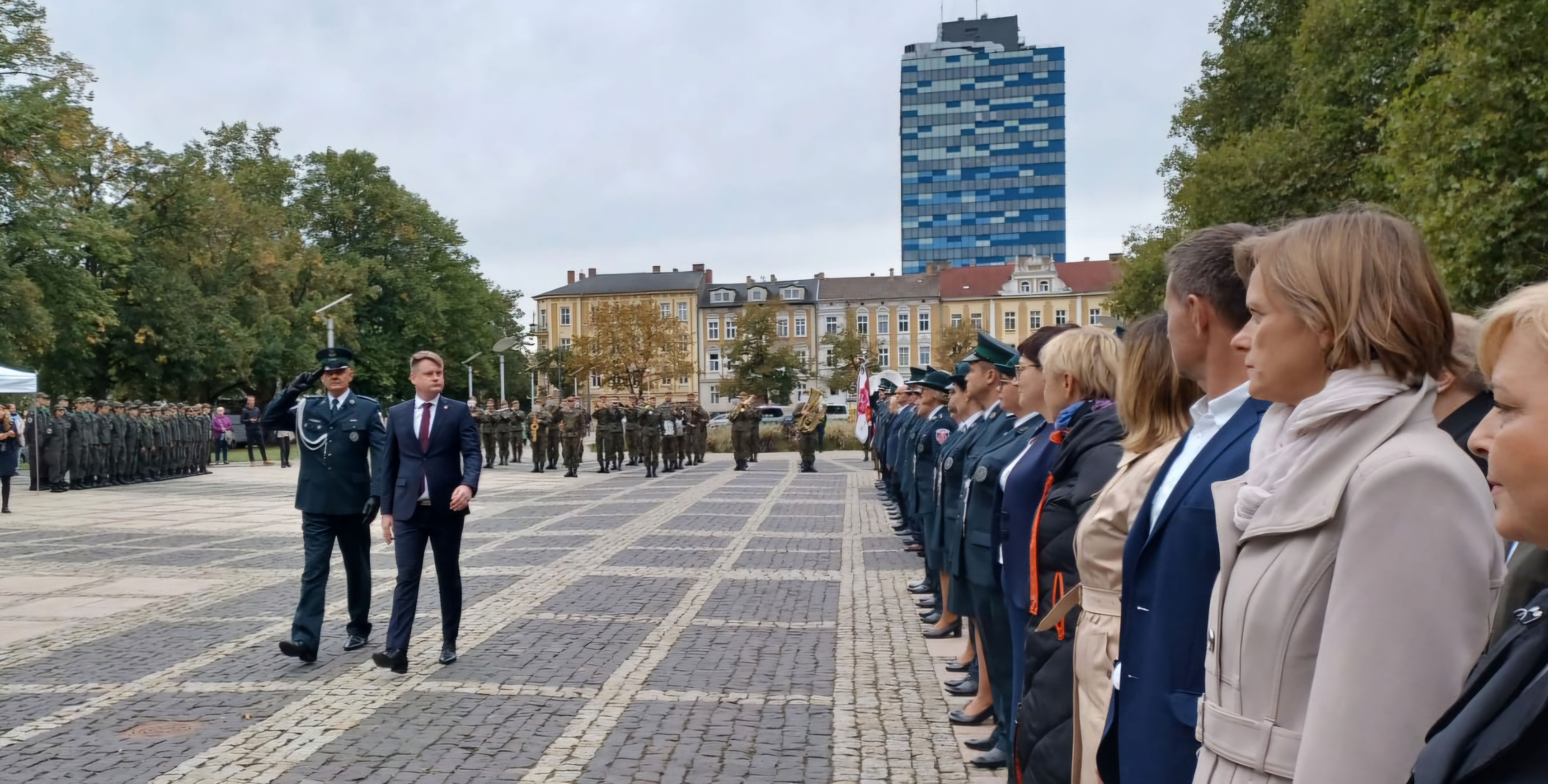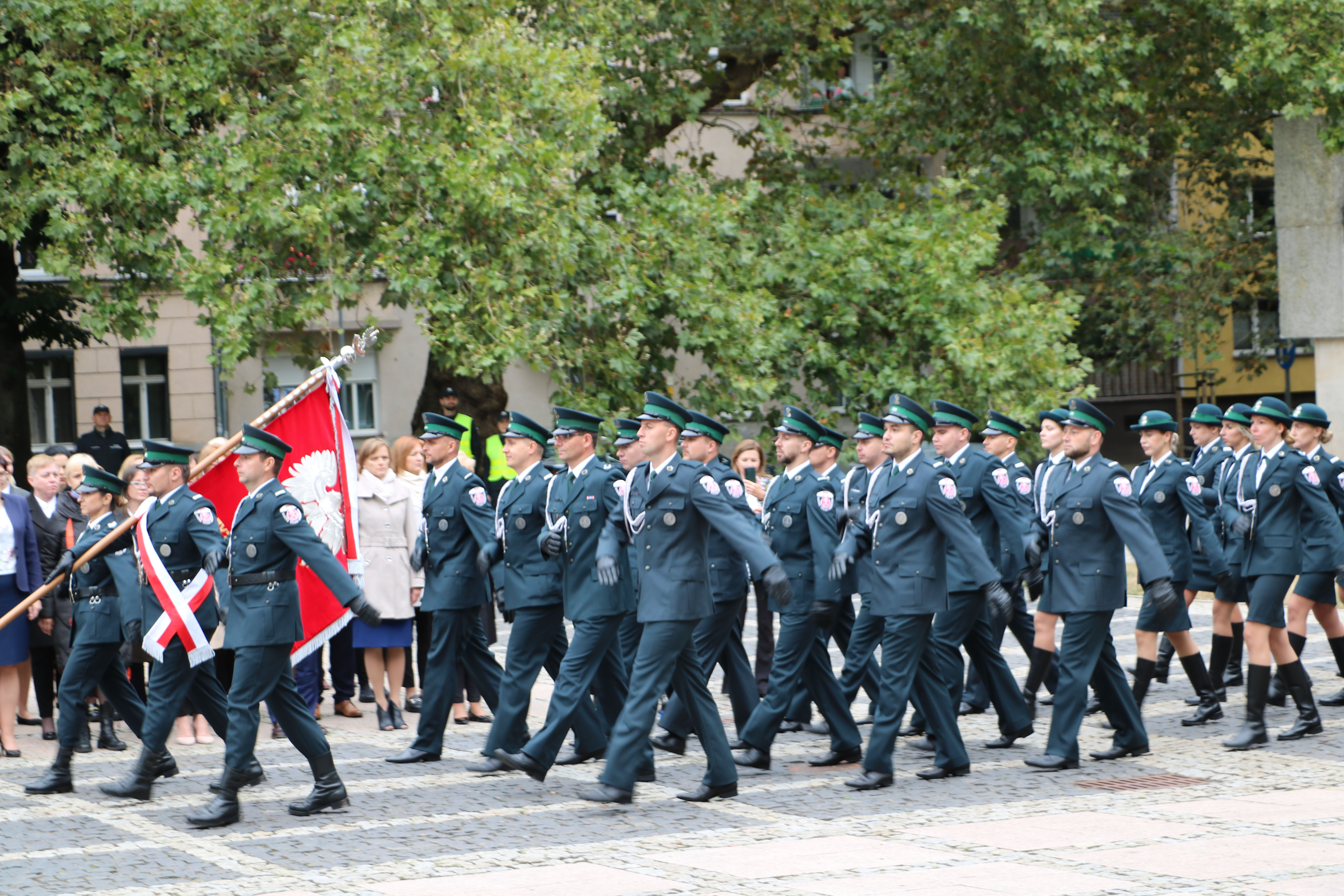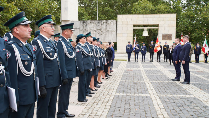 Reprezentacji KAS kroczą przed stojącymi w szeregu i funkcjonariuszami SCS i pracownikami.