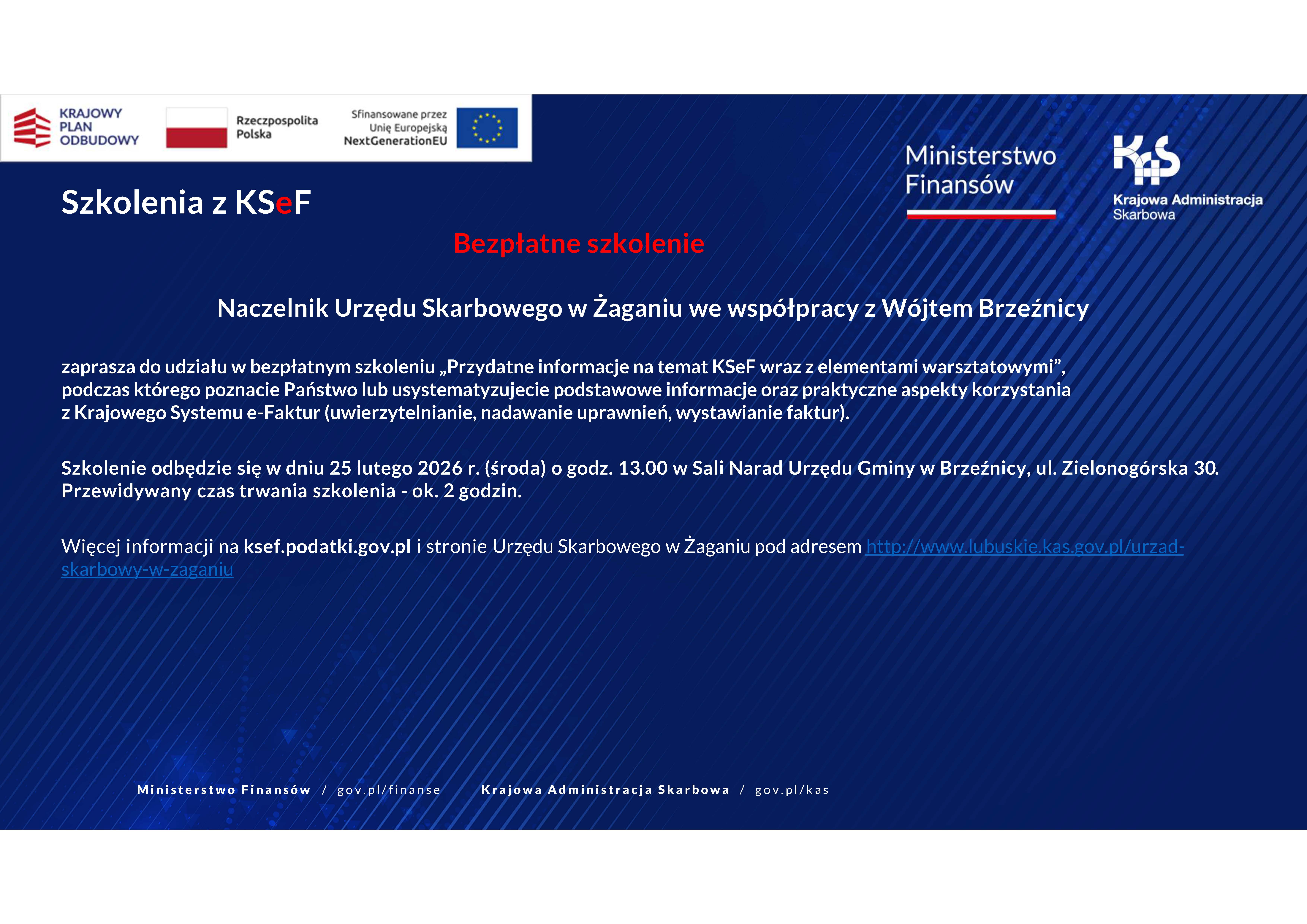 Więcej informacji na ksef.podatki.gov.pl i stronie Urzędu Skarbowego w Żaganiu pod adresem http://www.lubuskie.kas.gov.pl/urzad-skarbowy-w-zaganiu